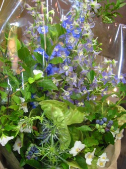 デルフィニウム2種類、アンスリウム、日の丸ウツギ、エリンジウム。)
