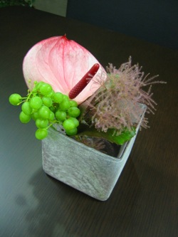 (写真はお祝いアレンジ。房スグリ、アンスリウム2種類、ヒペリカム、