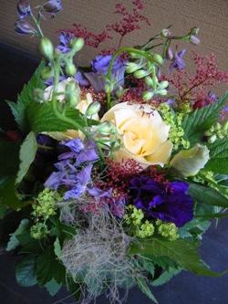 (写真はお祝いブーケ。バラ「ロマネスク」、ベロニカ、ヒマワリ、