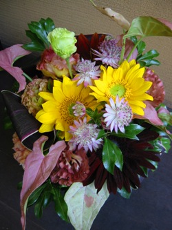 (写真はお礼のアレンジメント。ヒマワリ2種類、アストランティア、