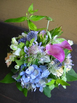 (写真はお祝いのアレンジメント。カラー、スカビオサ、あじさい、