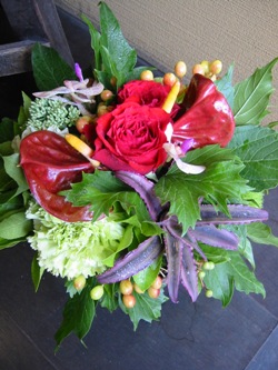 (写真は誕生日のお祝いアレンジ。バラ、アンスリウム、セダム、