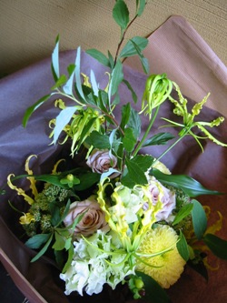(写真は送別用ブーケ。グロリオサ「ルテア」、バラ「イプノーズ」、