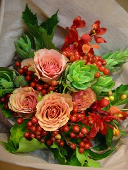 (写真は誕生日のお祝いブーケ。バラ、セダム、モカラ、