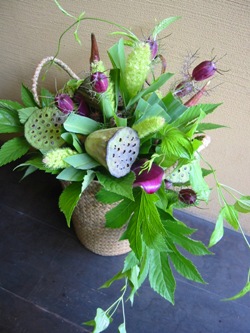 (写真は、ショップオープンのお祝いアレンジ。ハスの実、おくら、あわ、