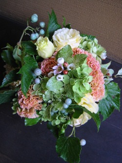 (写真は送別のアレンジ。トルコギキョウ、アナベル、ケイトウ、