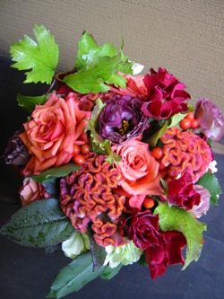 (写真はお祝いのアレンジ。バラ「カリエンタ」、トルコギキョウ、
