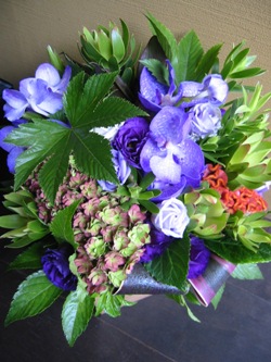(写真はお祝いのアレンジ。バンダ、トルコギキョウ、秋色あじさい、
