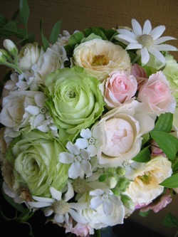 (写真は出産のお祝いアレンジ。バラ、トルコギキョウ、スカビオサ、