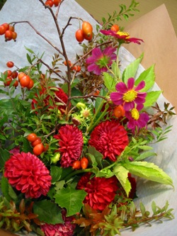 (写真はお祝いのブーケ。コスモス、ダリア、雪柳、鈴バラ、木苺。)