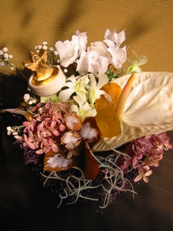 「ウェディングドレス」・秋色あじさい、デルフィニウム「パールホワイト」、
