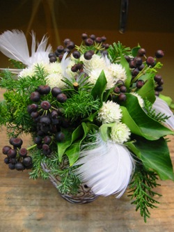 モミ、ヒムロ杉、クジャクヒバ、羽。器:キャンドルホルダー。)