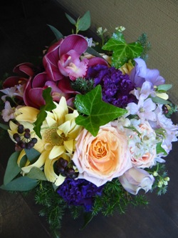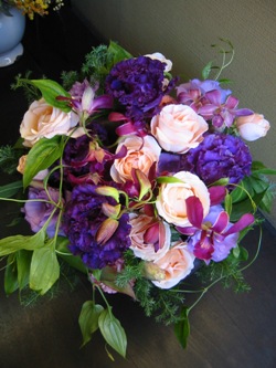 古希をお祝いする色”紫”の花を入れて。デンファレが超きれいで
