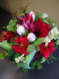 (写真はクリスマスプレゼントアレンジ。アマリリス「リロナ」、ダリア、