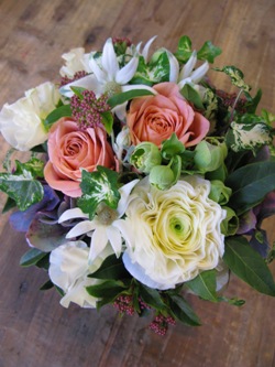 (写真は還暦のお祝いアレンジ。バラ「ヌーベルバーグ」、ラナンキュラス、