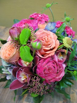 (写真は還暦祝いのアレンジ。シンビジウム、アンスリウム、カラー、木苺、