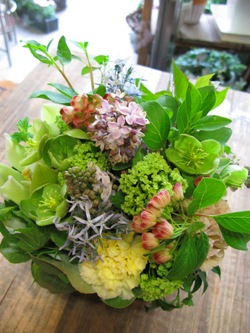 (写真は母の日アレンジ。カーネーション、ライラック、シンビジウム、