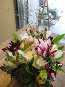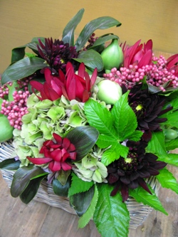 (写真はお祝いアレンジ。ダリア「ミズウノアール」、秋色あじさい、