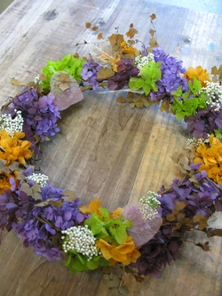 「”夏から秋へ”リース」です。紫色ベース!すっごい雨の中を来て