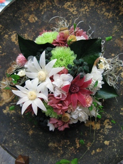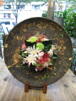 持ち込みの飾り皿風なものにアレンジしました。メインの花は