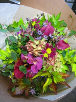 (写真は誕生日のお祝いブーケ。バラ「秋色ラディッシュ」、マトリカリア、