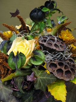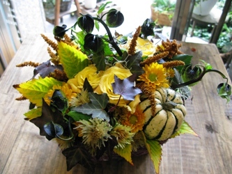 (写真はハロウィンアレンジ。かぼちゃ、クロホオズキ、スプレーマム、