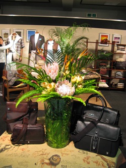 (左↑:プロテア、ストレリチア、アレカヤシ、モンステラ、リューカデンドロン、雲竜柳、タマシダ。