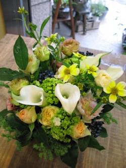 ↓はお祝いアレンジ。カラー、ドラゴン柳、シンフォリカルポス、マム、