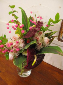 (写真↑は本日の活け込み。カフェのメインとトイレ。マユミ、アンスリウム、