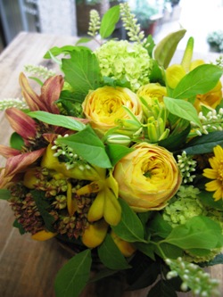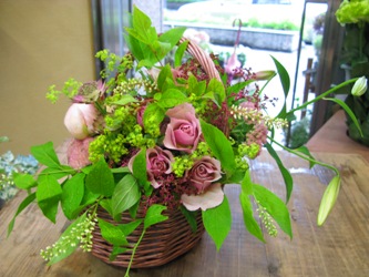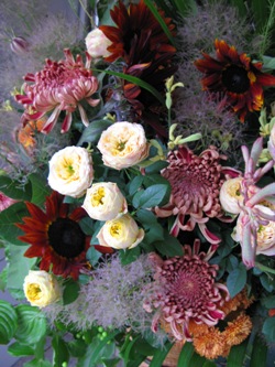(お花は、バラ「チョコレンジ」、キョウカノコ、芍薬「かぐや姫」、