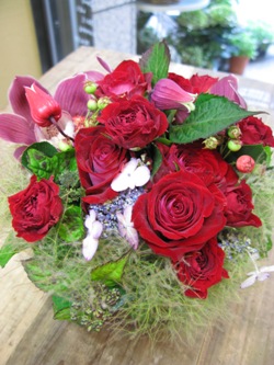 (写真は還暦のお祝いアレンジ。バラ、ジューンベリー、シンビジウム、