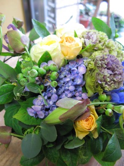 (写真は結婚のお祝いアレンジ。バラ「シェドゥーブル」、サンキライ、