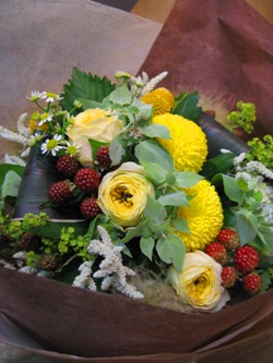 (写真は誕生日のお祝いブーケ。ピンポンマム、バラ「レモンラナンキュラ」、