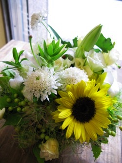 (写真はお祝いアレンジ。ヒマワリ、スカビオサ、パイナップルリリー、