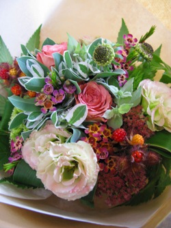(写真は送別用ブーケ。バラ「オリエンタルキュリオーサ」、山イチゴ、