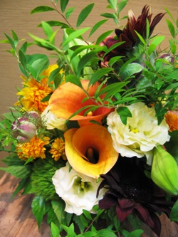 (写真は誕生日のお祝いアレンジ。カラー、マリーゴールド、バラ、