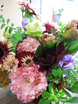 (写真はお祝いアレンジ。ヒマワリ「ココア」・「東北八重」、ニゲラの実、