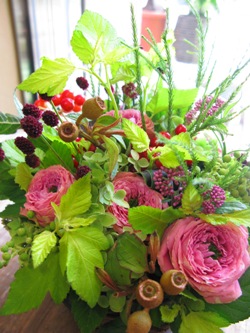カーネーション、木苺、秋色アジサイ、紅葉ヒペリカム など。)