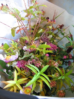 紅葉ヒペリカム、アストランティア、スカビオサ、チョウジソウ など。)