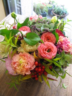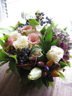秋色アジサイ、スプレーマム、木苺、紅葉ヒペリカム、アイビー、バーゼリア、