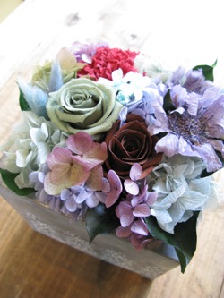 ↓お母さんへのアレンジ。共にプリザーブドフラワー。ブルー系と
