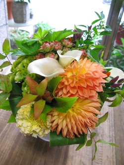 (写真↑はお供えブーケ。ダリア、カラー、木苺、バラ「ラディッシュ」、