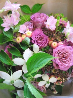 (写真は誕生日のお祝いブーケ。バラ「テナチュール」・「イプノイーズ」、