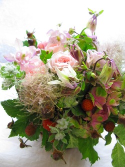 (写真はお供えアレンジ。オダマキ、スモークツリー、野いちご、