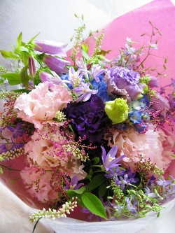 (写真は誕生日のお祝いブーケ。トルコギキョウ2色、芍薬、キョウカノコ、