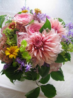 (写真↑は送別用ブーケ。ダリア、芍薬、バラ「ヒカル」、セダム、