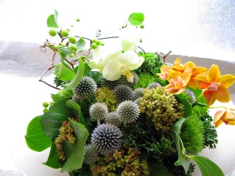 (写真は定期の活け込みのお花。ルリタマアザミ、胡蝶蘭、テマリソウ、