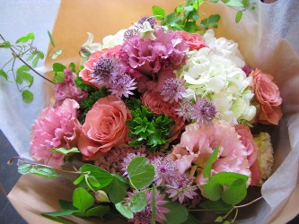 (写真はお見舞いブーケ。バラ「オリエンタルキュリオーサ」、クレマチス、