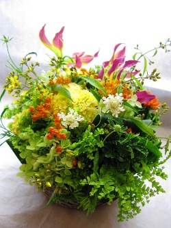 (写真はショップオープンお祝いアレンジ。グロリオサ、マリーゴールド、