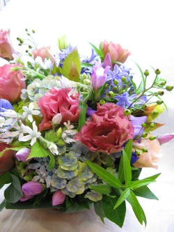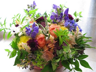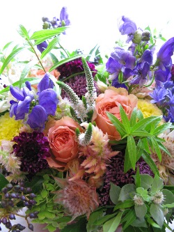 (写真はお供えアレンジ。トルコギキョウ、あじさい、ブルースター、リンドウ、